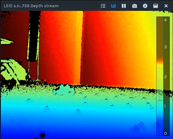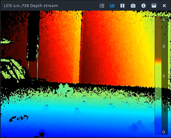 また、以下画像の右下に写っているように、Time-of-Flight (ToF)方式の3Dカメラである LIPSedge を同時に動かしたところ、L515 はLIPSEdgeから発せられる赤外線パターンの影響を受けているようです (左側2つの画面に写りこんだ3本の線)。